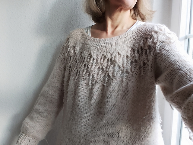 Gestrickt habe ich von Dezember bis Anfang Februar, und auch, wenn ich - aus Gründen, die ich nicht mehr ganz nachvollziehen kann - erst im Herbst angefangen habe, den Pulli öfter zu tragen, mag ich ihn gern und trage ihn recht oft. Nur der Halsausschnitt hätte einen Tick weniger weit sein können.