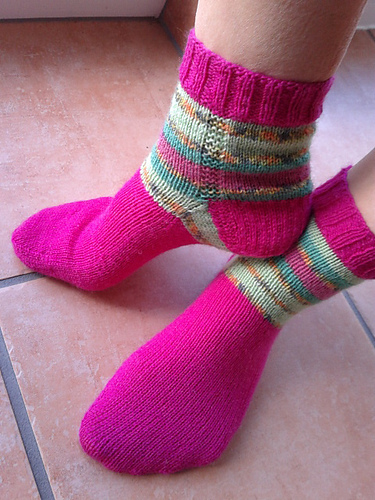 Ich hatte noch einen Rest Regia Circus Colour mit ein bissle Rosa und einen Rest Supergarne Aktiv in "so richtig schrei-barbierosa" herumliegen, die ich zu Barbie-Girl-Restesocken verheiratet habe. Zur Abwechslung habe ich mal nur 2er Nadeln genommen- gefällt mir aber nicht, der Stoff ist so steif und dick... dabei stricke ich nicht sonderlich fest. Also werde ich auf die Dauer wohl bei 2.5er Nadeln bleiben.