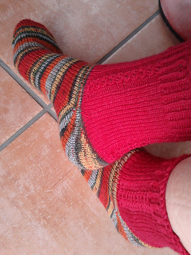 There is a KAL for this pattern in Angiies Podcast group - though I am not a huge fan of toe up, I have to try this very simple cast on an as well the three-part-shortrow-heel… Will probably do the feet in the self striping yarn and the cuff from the plain red I bought in January.