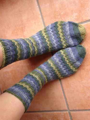 Ich fand immer die Jaywalker toll für streifiges Garn, aber die waren mir leider meist zu eng am Fuß trotz erhöhter Maschenzahl. Also habe ich mal ein bisschen gebastelt und das Ganze mit Löchern und Zöpfen gepimpt und raus gekommen ist meine höchstpersönliche Lieblingsversion für streifenbildendes Garn: https://www.ravelry.com/patterns/library/zz-toe