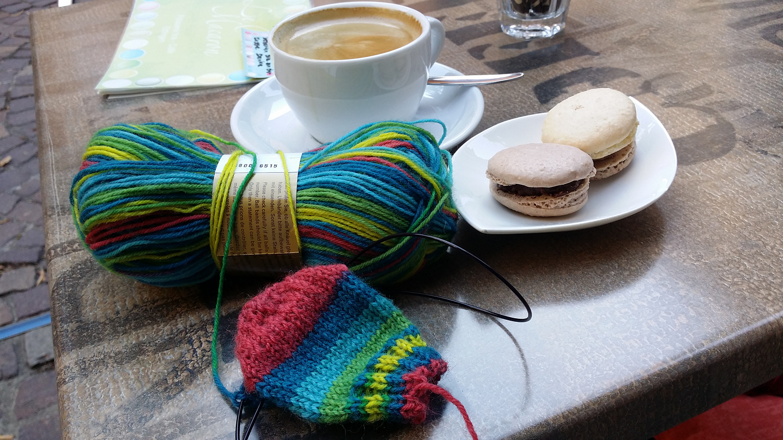 I also worked on point 8 on my list: I want to find a knitting group here in Ettlingen to meet on Thursday. I did my first step here as well, I went to the Café Petit Macaron this Thursday (which happens to be directly opposite from the LYS Wollparadies) and had a coffee and some Macarons.