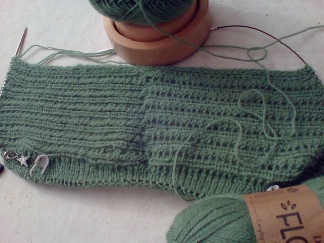 Die Jacke wird an den glatt rechts gestrickten Ärmeln begonnen, das ist am Anfang ein bissle öde, hat aber den Vorteil, dass die Ärmel dann schon mal fertig sind. Das Lacemuster im Hauptteil ist interessant, ohne zu kompliziert zu sein, auch wenn ich es natürlich geschafft habe, diverse Fehler einzubauen. Aber die sieht man beim Tragen nicht, würde ich sagen. Ich bin also schwer begesstert und plane immer noch eine Sommerversion dieser Anleitung.