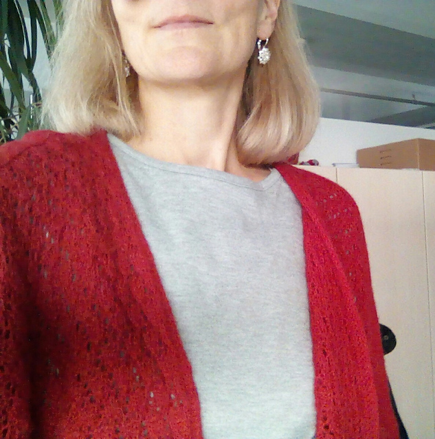 Allerdings: Einer der Gründe, warum ich diese Jacke unbedingt stricken wollte, war, dass man sie auf zwei Arten tragen kann: Einmal mit dem Laceteil oben, wie auf den Fotos, und einmal mit dem glatt-rechts-Teil oben. Das habe ich zwar auch schon mal probiert, es hat mir aber nicht sooo gut gefallen, so dass ich wohl hauptsächlich diese Variante tragen werde. Mal sehen, vielleicht ist das ja in dem flutschigeren Bambusgarn anders.