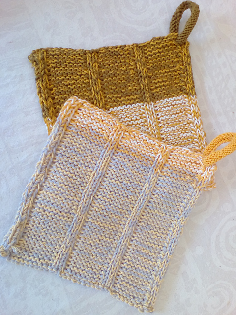 "Baker's Twine"-Topflappen >> werden sogar mit doppeltem Faden gestrickt, sind deshalb besonders dick und als Topflappen sehr gut geeignet. Der besondere Clou sind die "Ringel-Aufhänger", die vorher mit einfachem Faden separat gestrickt wird.