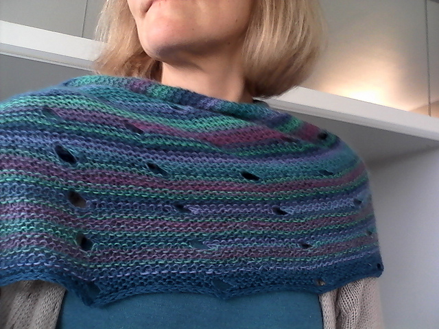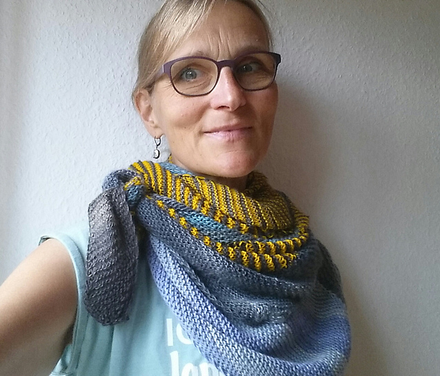 Allerdings trage ich das Tuch nicht ganz so oft, weil die Form etwas asymmetrisch ist, was ich nicht so gut drapiert bekomme. Und durch das Patent ist das Tuch recht dick, drum auch sehr warm - oft zu warm...