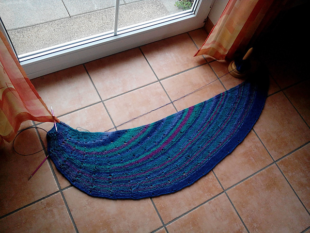 Auf dieses Tuch habe ich schon lange ein Auge geworfen gehabt, weil ich die vielen Hebemaschenmuster so toll fand. Meine Version >> ist komplett aus Sockenwollresten und ich mag das fertige Tuch sehr und trage es häufig.
