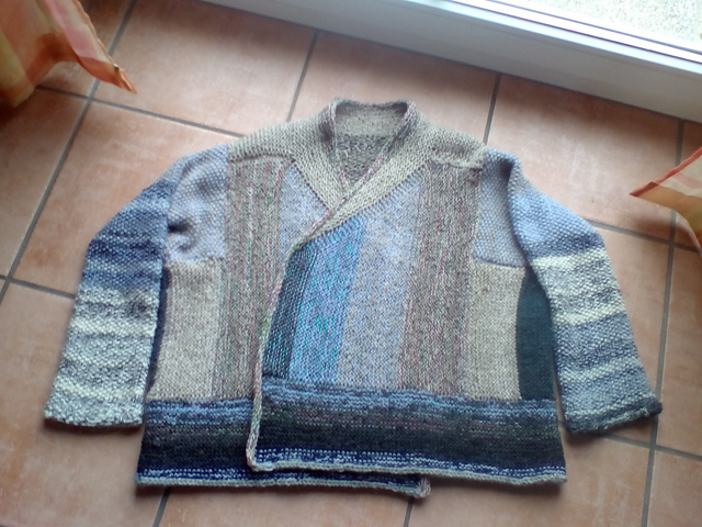 Meine Version ist komplett aus geribbelter Wolle >>, die durchgehend doppelt gehalten wird. Dadurch ist die Jacke natürlich sehr warm aber das ist ja auch der Zweck der Übung. Allerdings muss ich zugeben, dass ich sie wegen ihrer "Buntheit" bisher selten getragen habe - aber mir kommt gerade in den Sinn, dass das doch die ideale "Home Office am PC"-Jacke wäre - ich denke, ich werde sie mal aus dem Schrank holen...