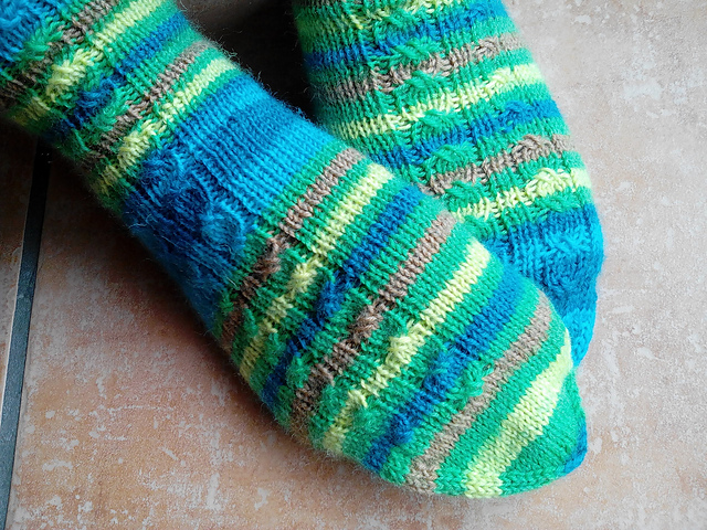 Wie Sie sehen, sehen sie nichts - das Muster wird von der bunten Wolle "gefressen", das sieht man auch "in echt" nicht wirklich, hätte ich mir also sparen können. Für die großen Männersocken waren die Musterrapporte aber eine ganz gute Motivationshilfe, so sind sie doch recht schnell fertig geworden.
