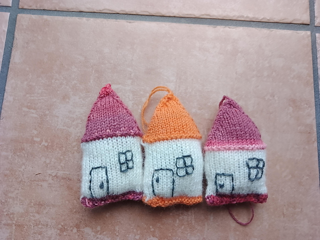 Diese Häuschen nach einer kostenlosen Drops-Anleitung habe ich 2024 gestrickt.