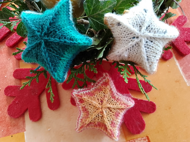Diese Sterne sind ein Klassiker in der Strickwelt, die Anleitung kannte ich schon vor Ravelry, also so 2006 oder so. Zum ersten Mal gestrickt habe ich sie aber erst 2022 >>, und meine liebste Anleitung sind sie nicht... Man fängt den Stern außen an, muss also ziemlich viele Maschen anschlagen, nimmt dann ab bis zur Mitte. Dann nimmt man Maschen aus dem Rand aus und strickt die zweite Hälfte dran. Das Ergebnis ist hübsch (ich habe wie immer Sockenwollreste verwendet), aber wie gesagt, mir ein bissle zu fummelig - gibt ja genügend andere hübsche Anleitungen.