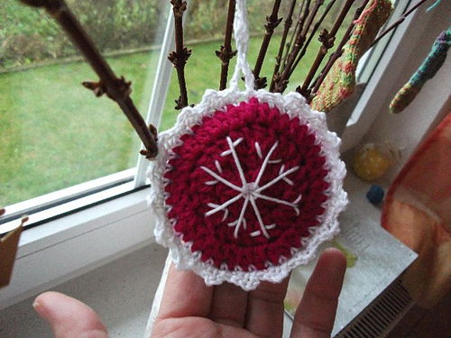 Auch diesen Anhänger habe ich in meiner "Häkelphase" 2010 gemacht >>, mittlerweile gibt es die "Anleitung" leider nicht mehr online. Ist aber kein Hexenwerk: Einfach einen Kreis mit 12 Stäbchen anschlagen, drei Runden draufhäkeln (dabei in der 2ten Runde jedes, dann jedes 2te Stäbchen verdoppeln), zwei Kreise häkeln, zusammenhäkeln und dann die Schneeflocke draufsticken.