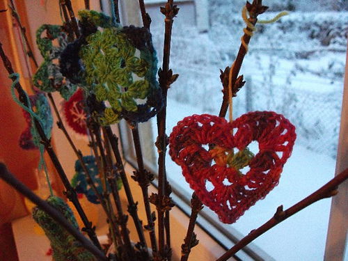 Als ich das Sternchen gehäkelt habe, war ich gerade in einer Häkelphase und habe auch diese Herzen gemacht. Sind auch ganz hübsch, gefallen mir aber nicht so gut wie die gestrickten Herzen. Die gehäkelte Version geht allerdings viiiiel schneller!