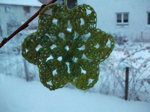 Diesen gehäkelten Schneeflockenanhänger habe ich 2010 gehäkelt, bevor der große Schnee kam