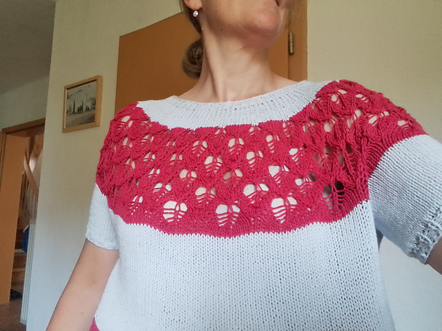 Außerdem habe ich bis zur Ärmelabtrennung noch "Make it Blümchen" Beilaufgarn mit Pailletten * >> mitlaufen lassen, das sieht man allerdings nur bei Kunstlicht richtig gut (aber genau da will ich den Pulli ja auch anziehen). Beim Blautmuster hab ich es aber weggelassen, denn Maschen zusammenstricken mit drei Fäden pro Masche- muss ich nicht haben.