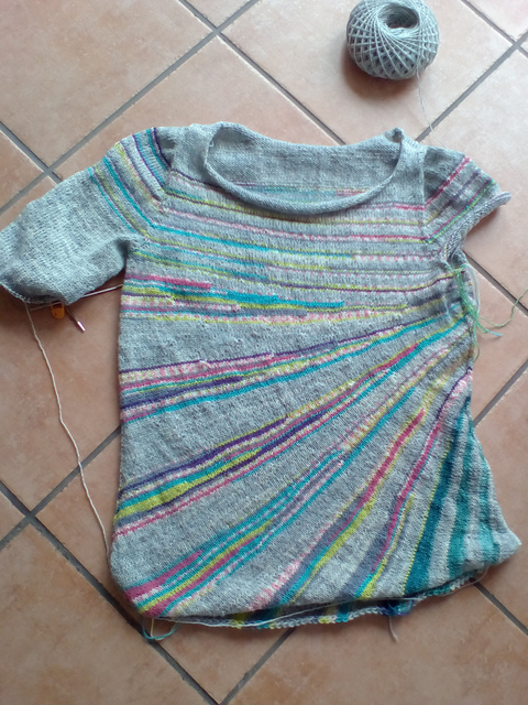 Nach langem Zaudern habe ich mich dann für das Crazy Striped Tee >> entschieden, eine Kaufanleitung auf Englisch auf Ravelry. Das Top wird Top-Down gestrickt, mit einer Art Sattelschulter-Konstruktion. Die habe ich zwar gemacht, weil ich's mal probieren wollte, aber beim nächsten Mal würde ich tendenizell eher einen Raglan machen, denn hier war mir ein bissle zu viel Abschneiden und Maschen auffassen dabei.