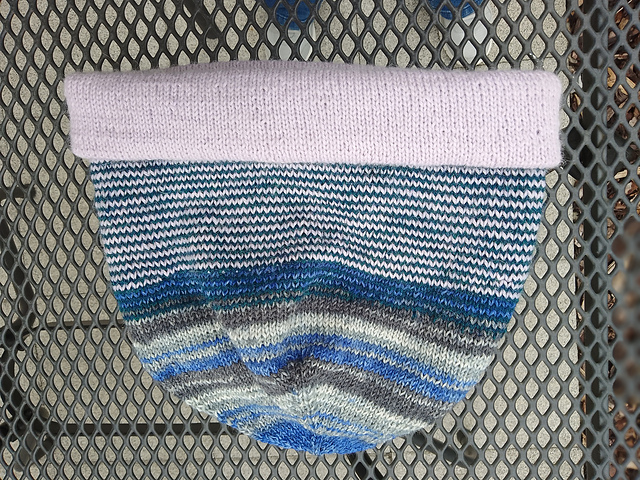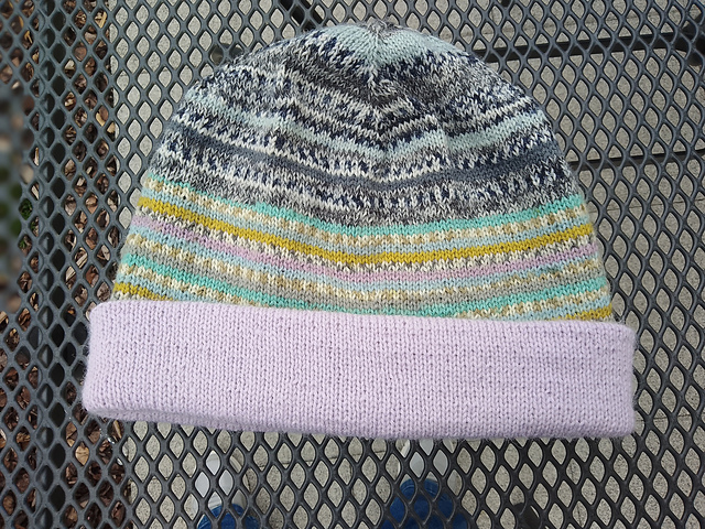 Wenn Du den unteren Teil umklappst, ist sie da sogar 4lagig, also wirklich, wirklich warm. Ich habe einen recht großen Kopf, also habe ich in Sockenwollstärke auf 144 Maschen zugenommen. Für mich hätten es vielleicht auch 4 oder 8 Maschen weniger getan, aber ich habe überlebt, die Mütze zu verschenken, und die angedachten zu Beschenkenden haben sogar einen noch dickeren Kopf als ich.